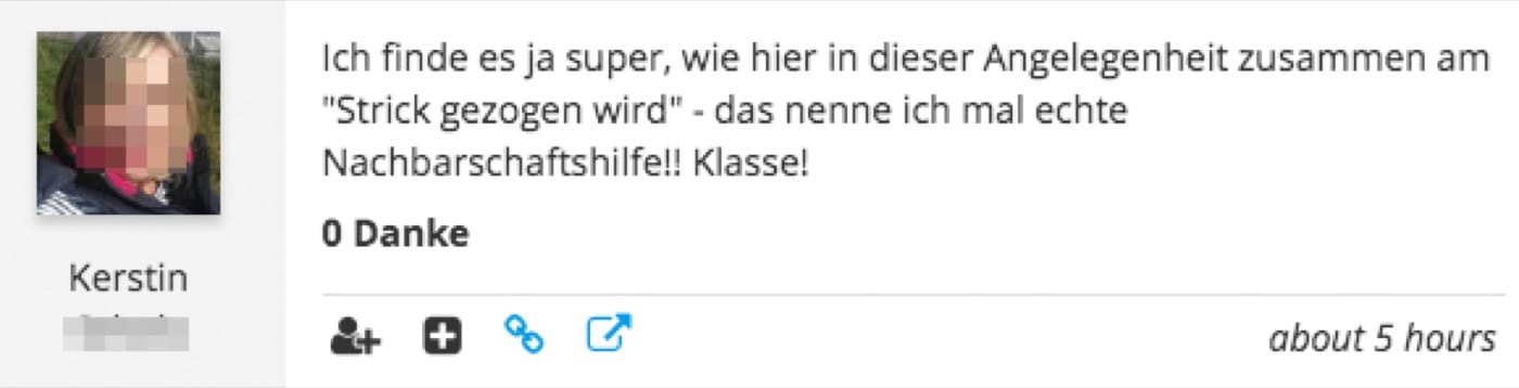Auch bei nebenan.de verfolgen die Nachbar:innen die Hilfsaktion. Zum Beispiel schreibt Nachbarin Kerstin über die nachbarschaftliche Initiative: