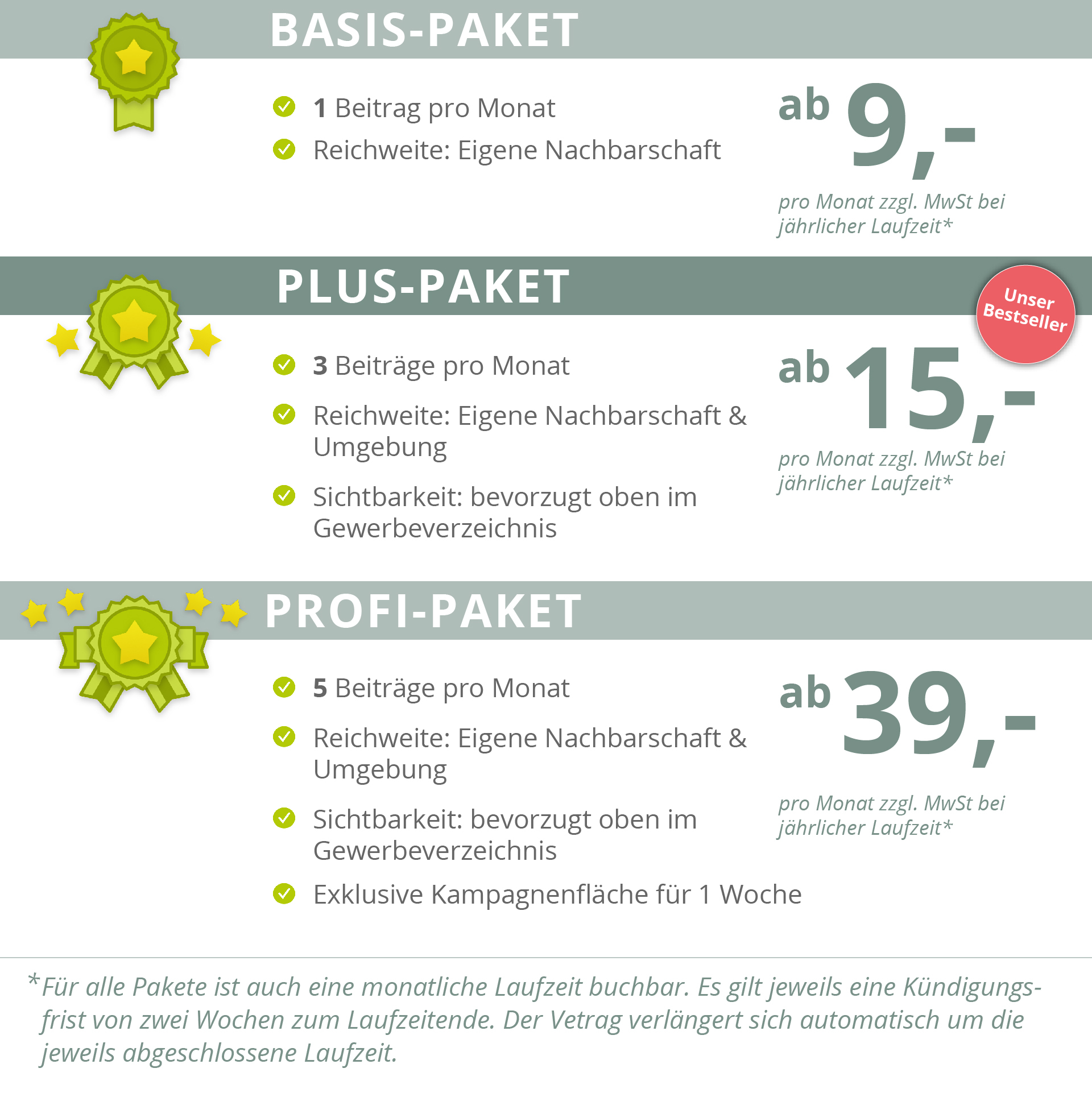 Unser Tipp: Du kannst die verschiedenen Zusatz-Pakete jederzeit testen. Buche ein Zusatz-Paket deiner Wahl für wenige Monate und werde in der Nachbarschaft aktiv. Zu allen Inhalten und Konditionen.